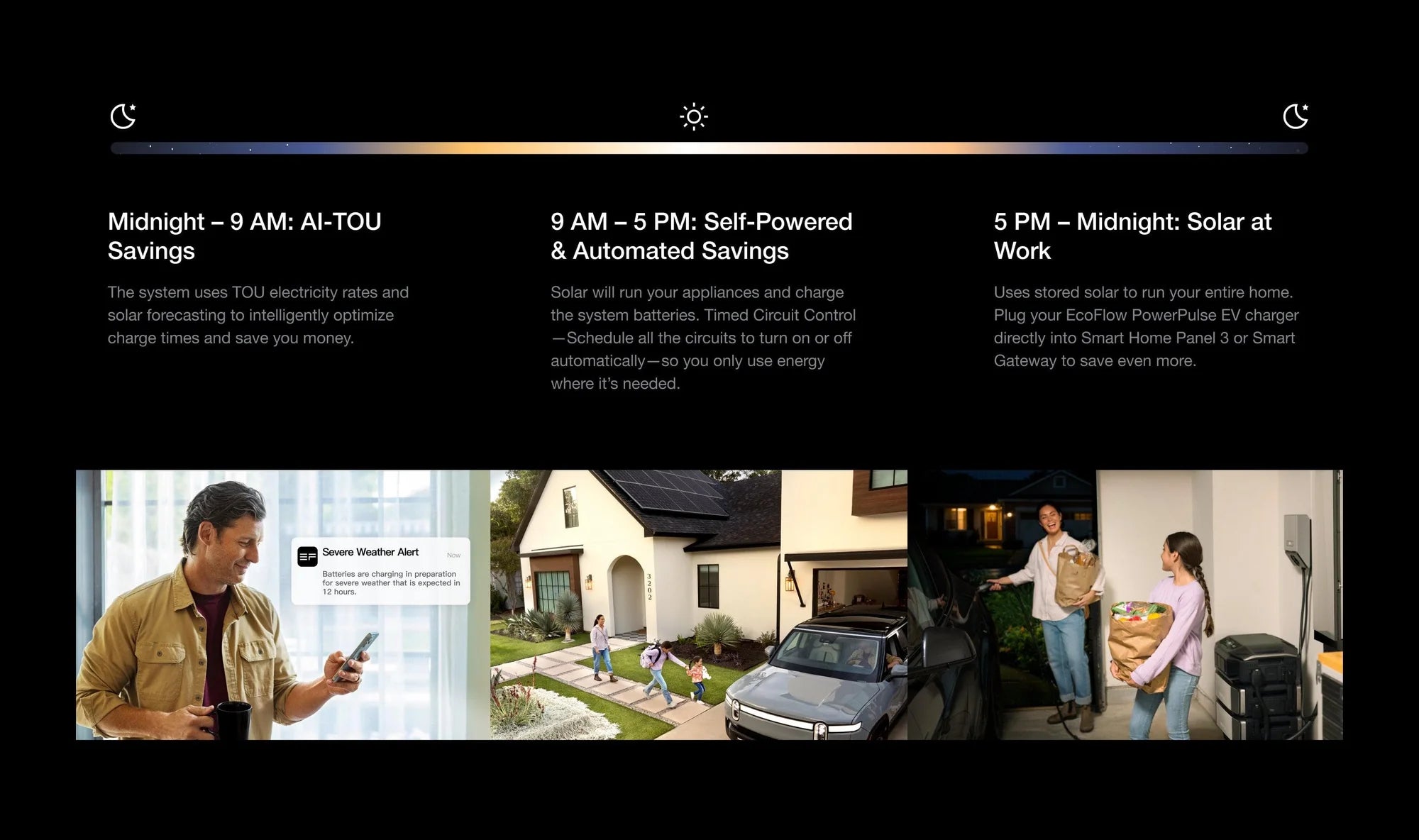 Day and night, the system intelligently shifts between solar, storage, and off-peak rates—maximizing every watt to get you the best deal. Here's what that might look like on a typical day of use.