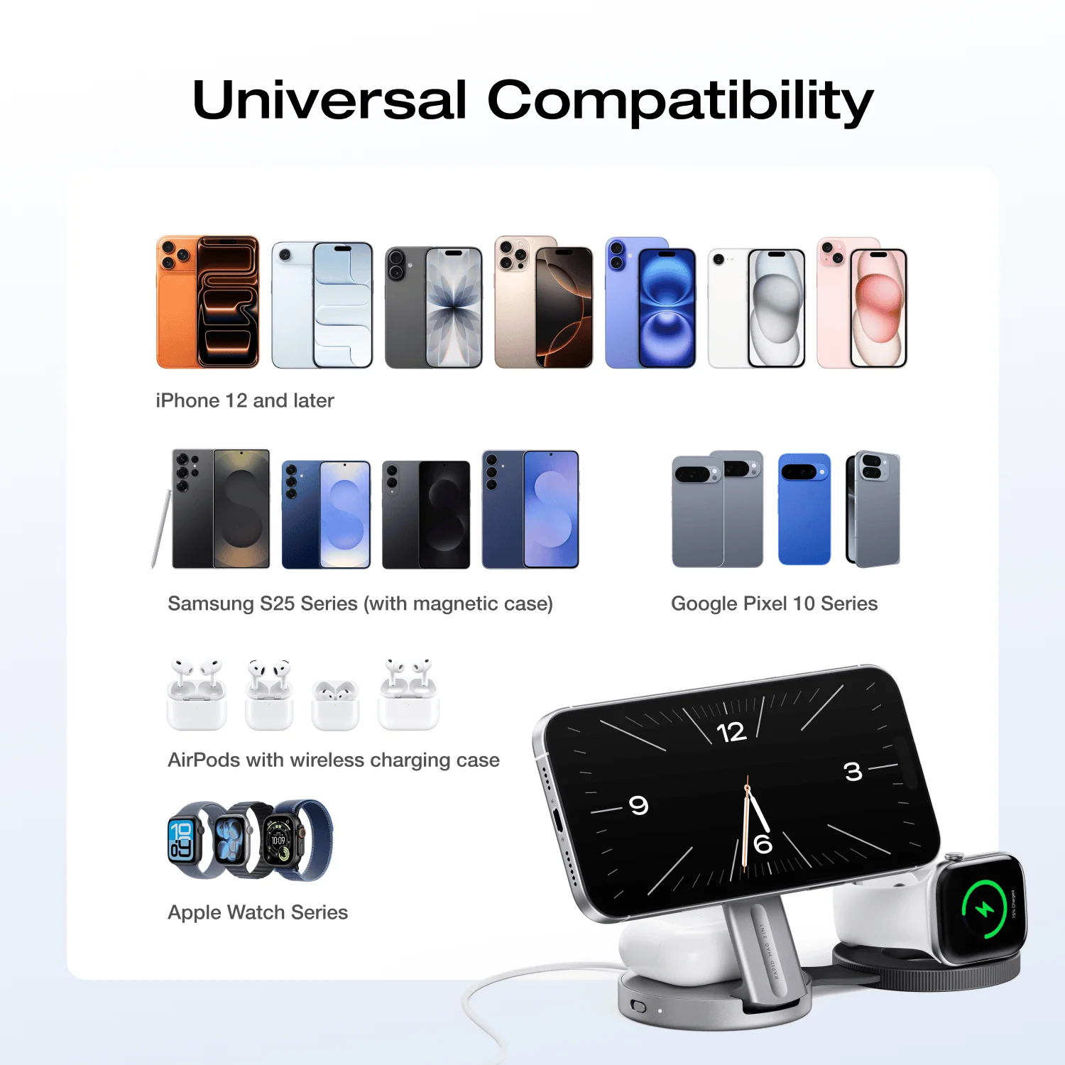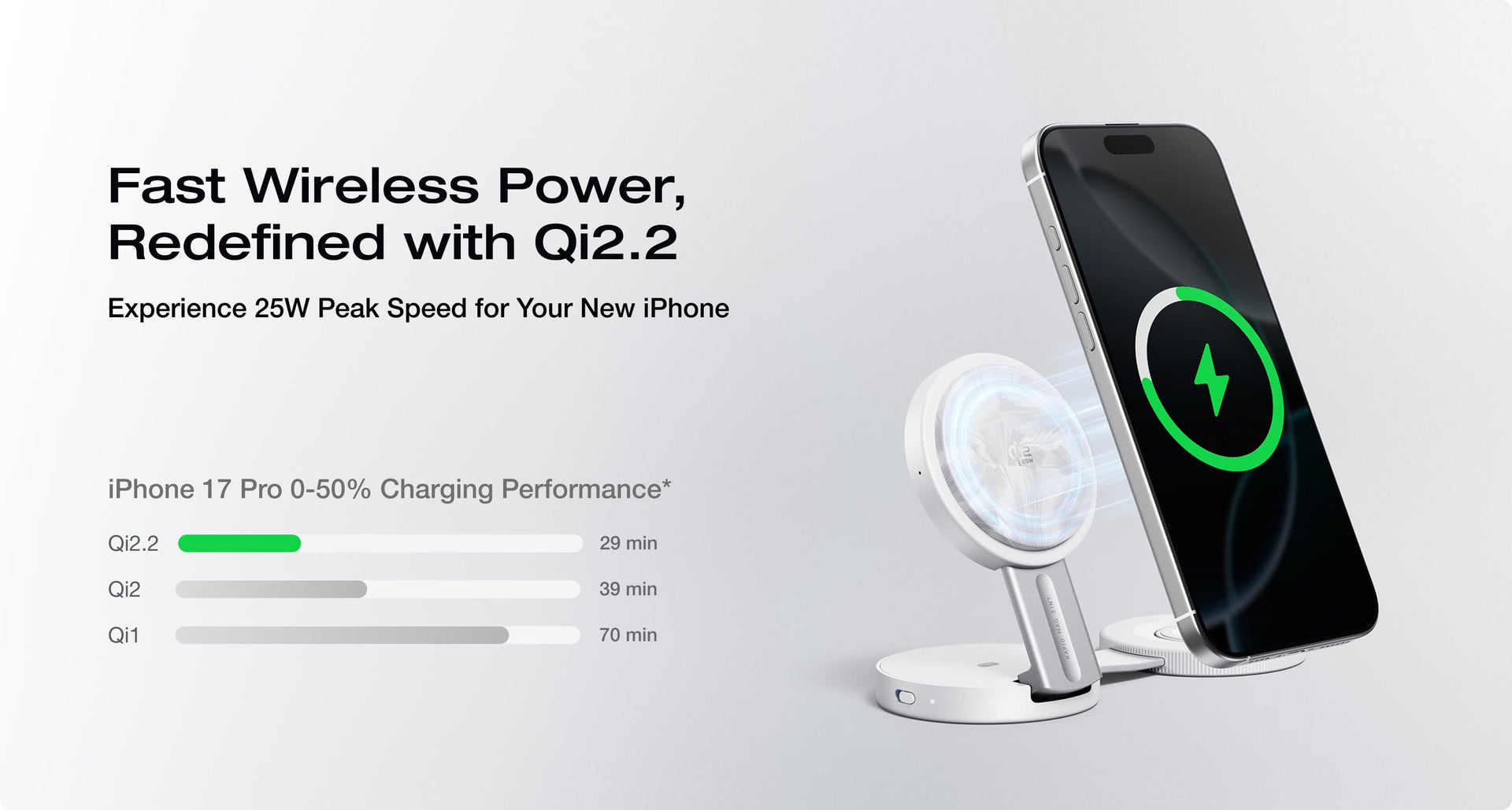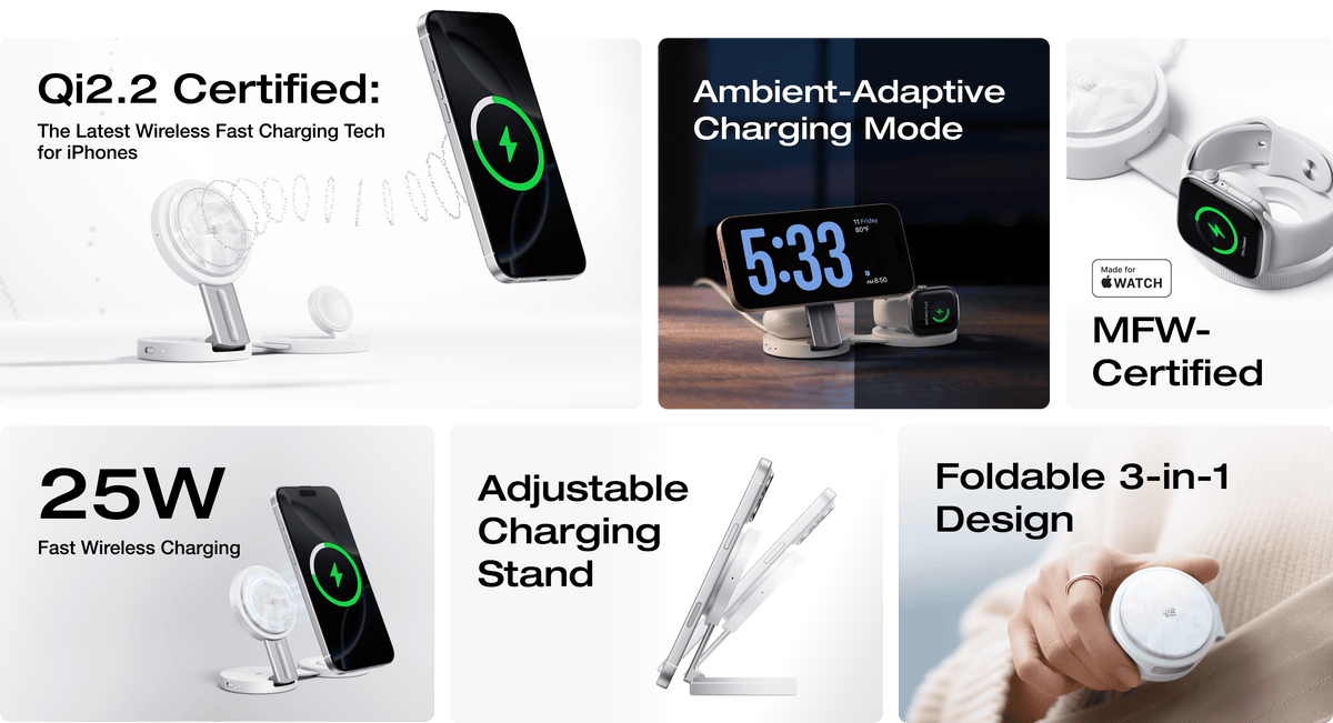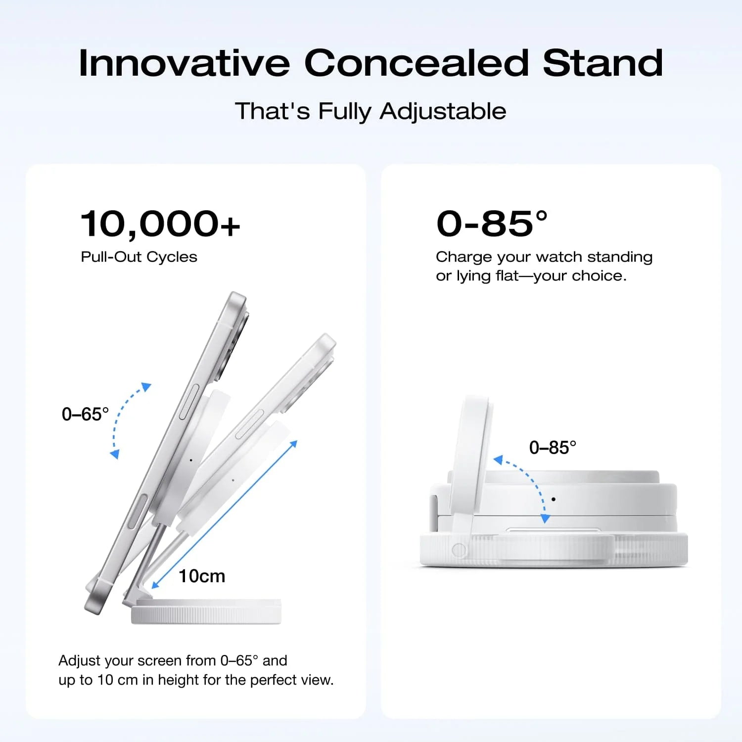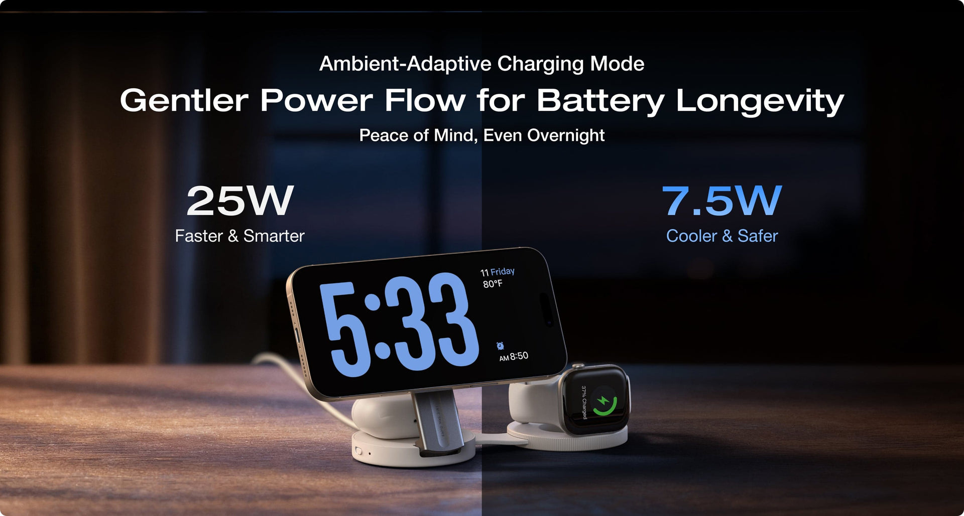 Powered by advanced safety technology, RAPID Mag Wireless Charging Station runs 5 million self-checks daily — keeping temperatures under 107.6℉ (42℃)* to protect all your Apple devices. If heat builds up, it automatically adjusts power to prevent risks, so you can use it for hours, worry-free.