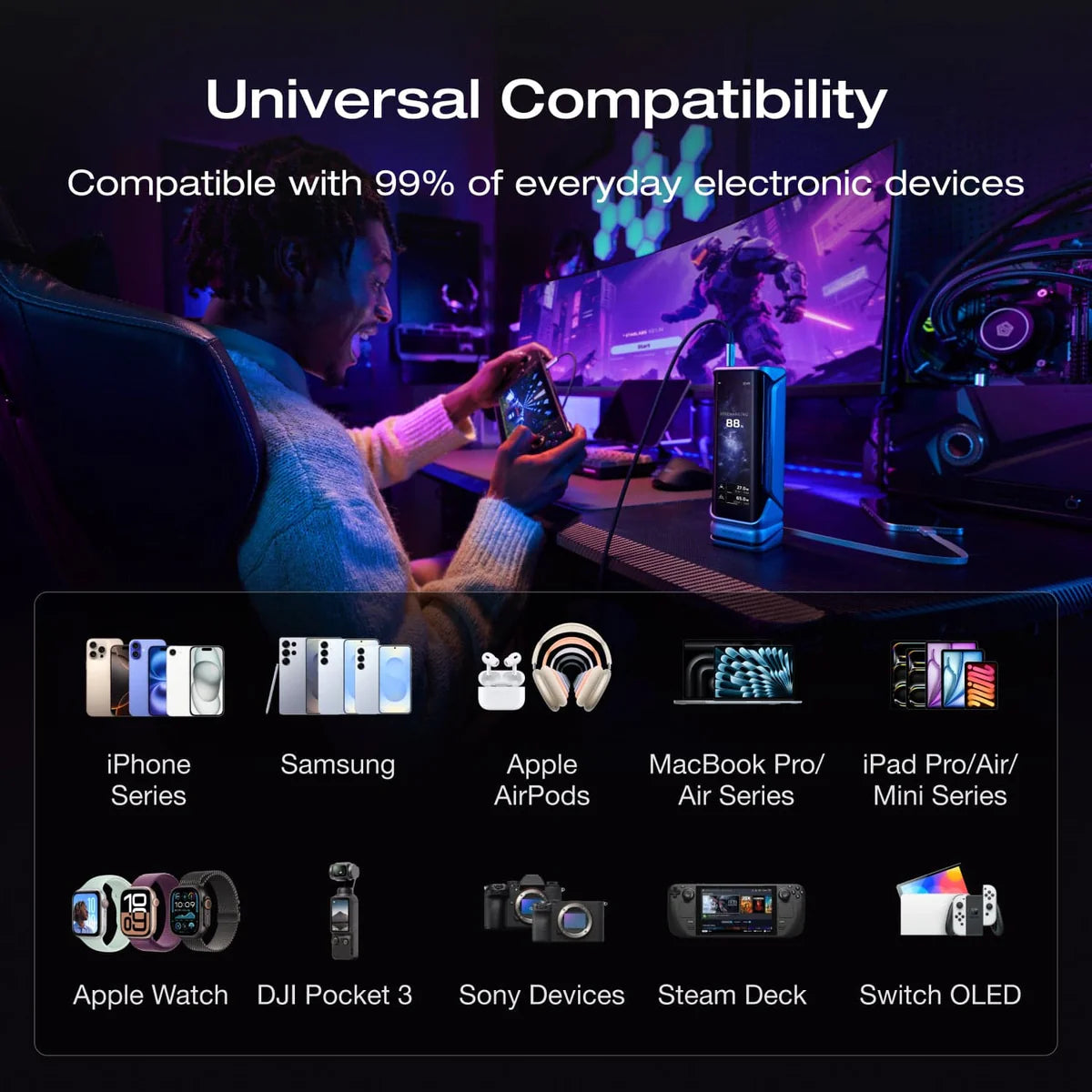Compatible devices are laptops, phones, tablets, headphones, smartwatches, game consoles and other devices with USB-C ports such as MacBook Pro/Air, iPhone,iPad, Dell XPS and Samsung Galaxy.