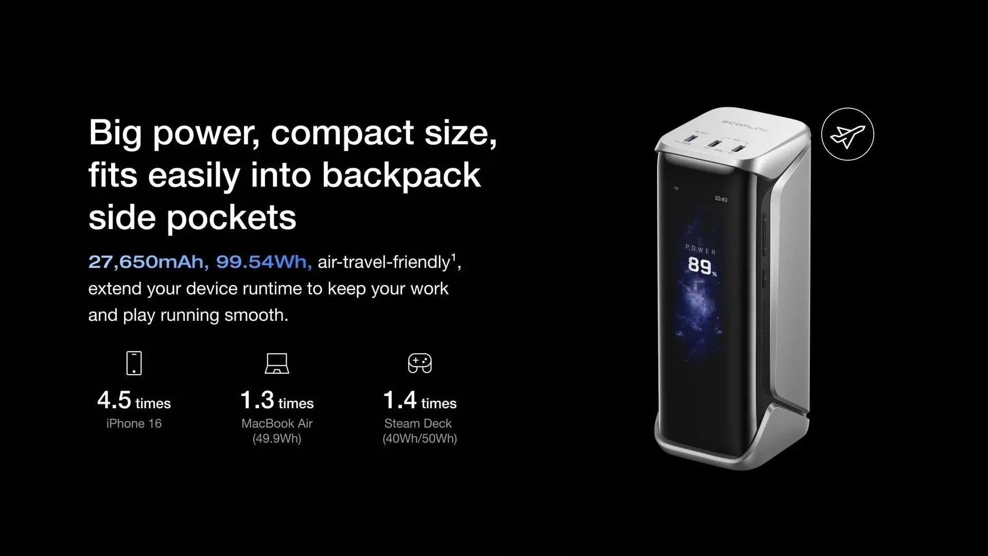 Yes, according to regulations by the International Civil Aviation Organization (ICAO) and most airlines, carrying a power bank with a capacity under 100Wh is allowed. The RAPID Pro, with a capacity of 27650mAh (99.54Wh), meets this requirement and can be carried on board without concern..