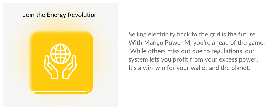 Invest in an energy solution that pays you for the excess power you generate. The Mango Power M will keep storing energy and then send it back into the grid according to the regulations of your local utility provider.