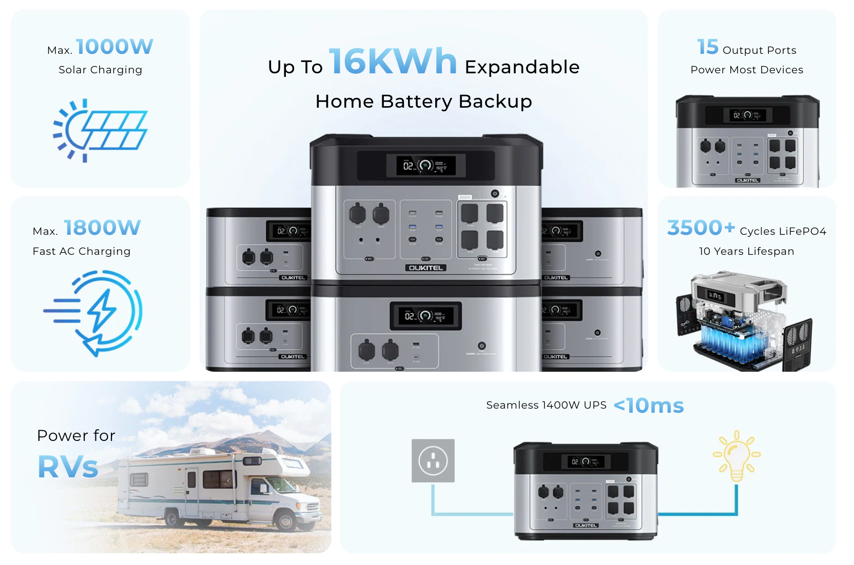 OUKITEL BP2000 with up to 7 x B2000 expansion batteries in parallel to reach 16kWh, and meet the family's power need for 1-6 days. The robust structural design ensures stability and worry-free usage.