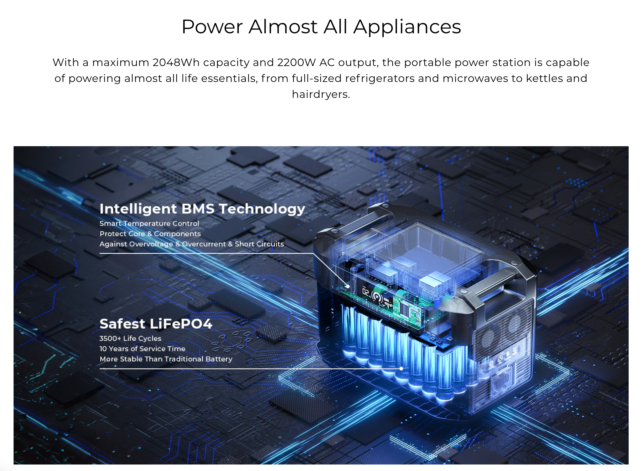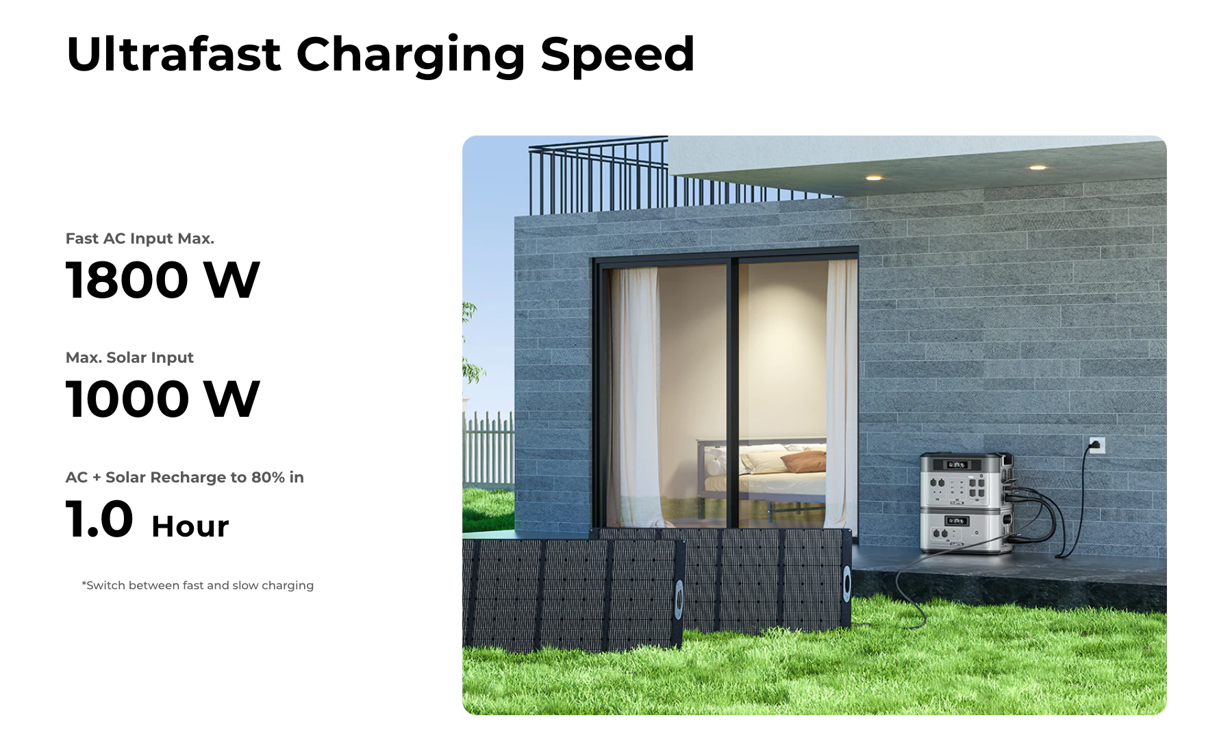 Fastest Recharging: Charge from 0 - 80% in 1.5 hours with AC1800W Max. input, PV1000W + AC1500W dual recharge to 80% in just 1 hour.