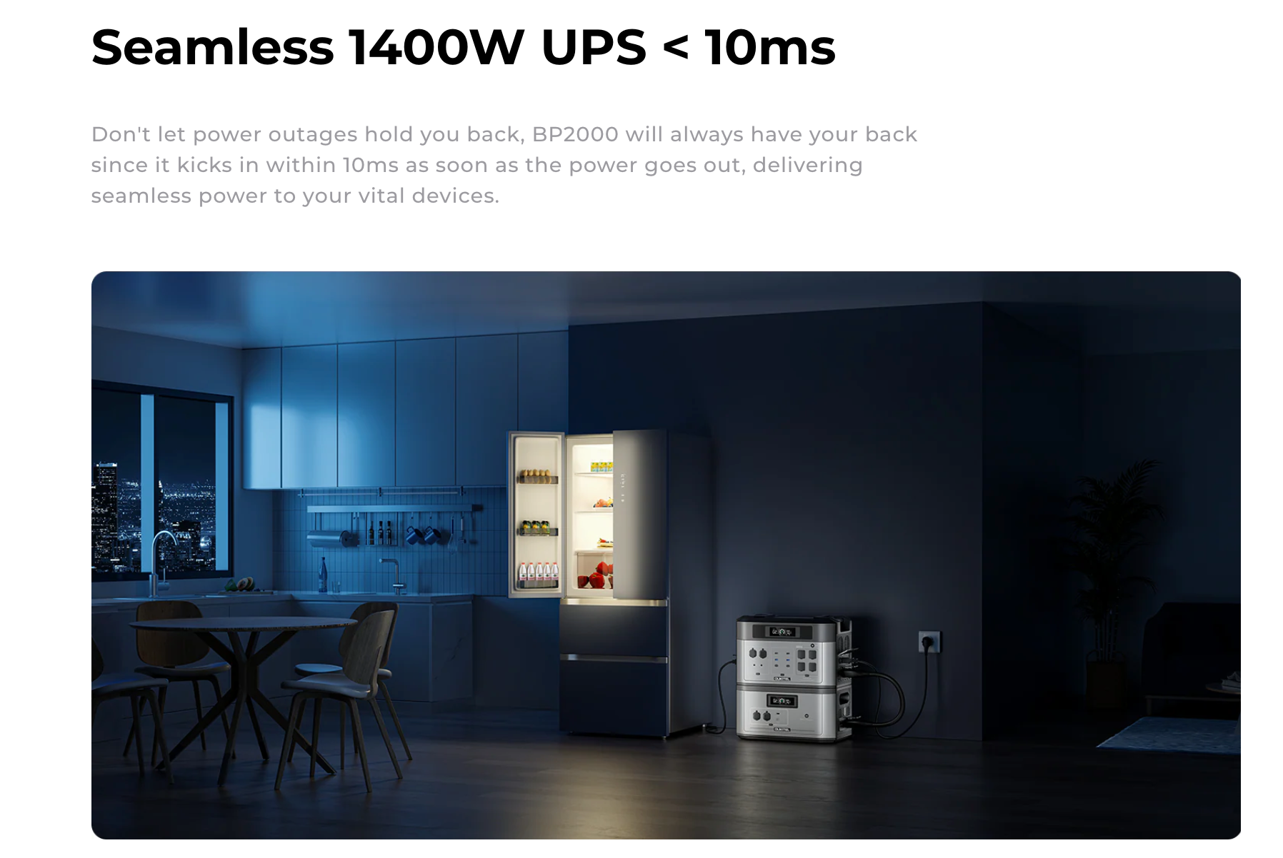 By directly connecting the BP2000 with a dual power automatic transfer switch, when a blackout hits, it can continue to power your important home devices such as your fridge and lights for hours.